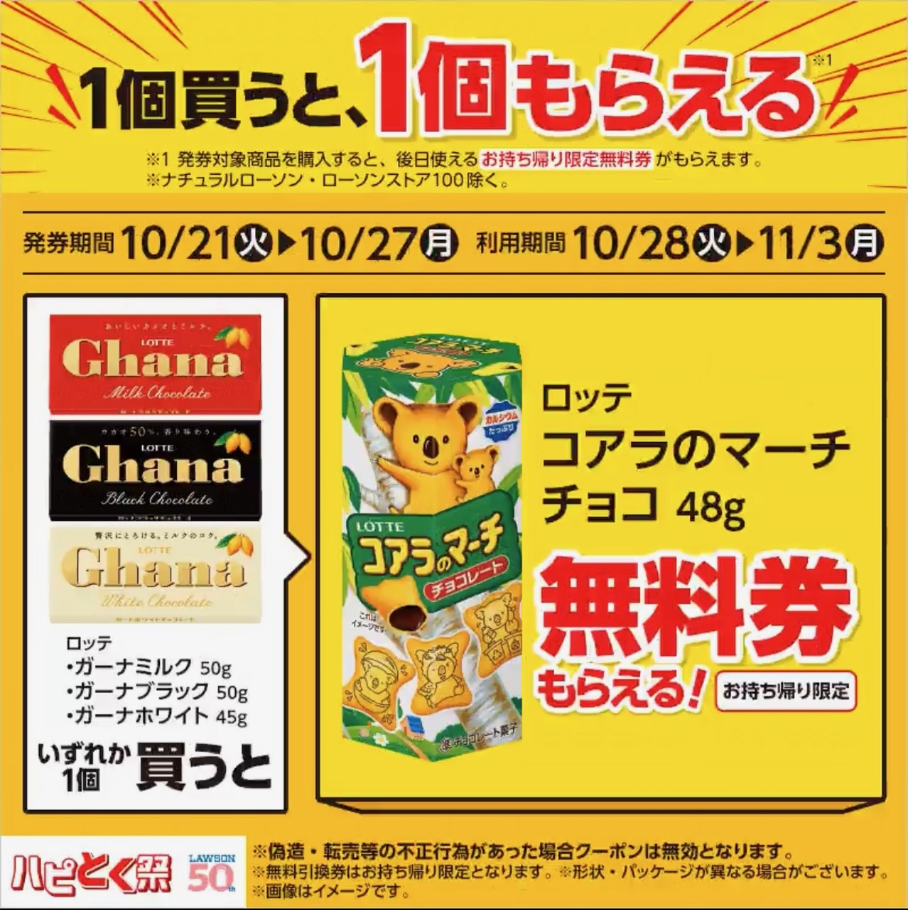 | ■対象商品 ロッテ ガーナ ブラック 50g ロッテ ガーナ ホワイト 45g ロッテ ガーナ ミルク 50g  | ■引換商品 ロッテ コアラのマーチ チョコ 48g  |