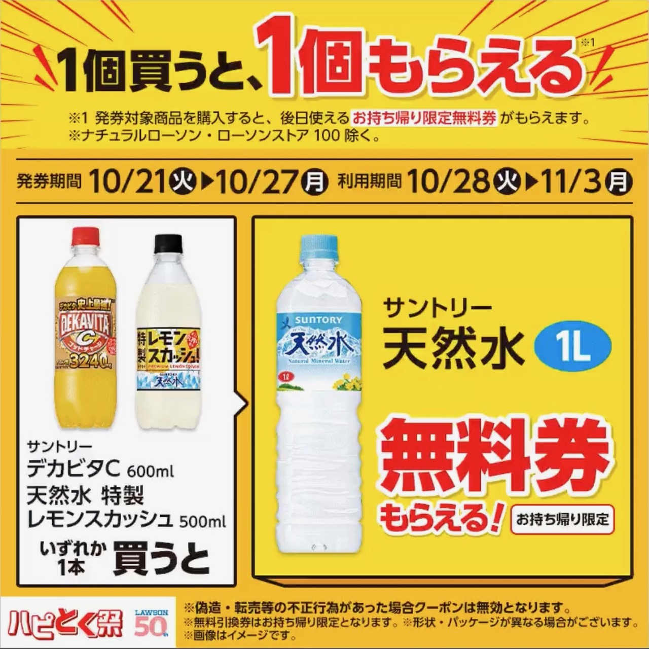 | ■対象商品 サントリー デカビタC 600ml サントリー 天然水 特製レモンスカッシュ 500ml  | ■引換商品 サントリー 天然水 1L  |