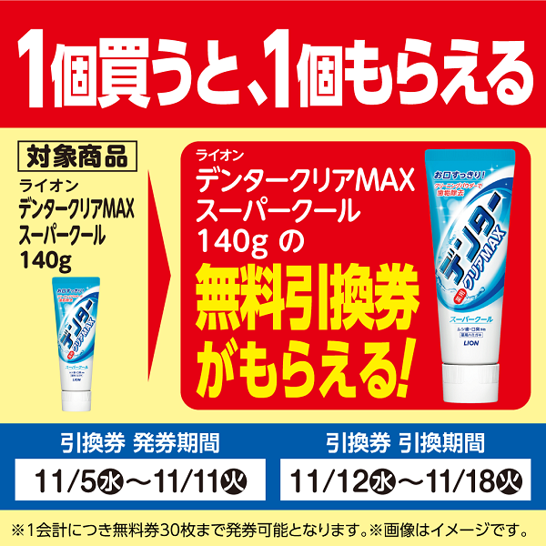 スポンサーリンク 【プライチ】2025年11月5日(水)よりローソンストア100で開催される今週のオトクなプライチ情報 プライチ 2025.11.05 珍しく重複無しのパターンですねぇ…。 ライオン デンタークリアMAX スーパークール 140g ■発券期間2025年11月5日(水)~2025年11月11日(火)■引換期間2025年11月12日(水)~2025年11月18日(火)■対象商品ライオン デンタークリアMAX スーパークール 140g■引換商品ライオン デンタークリアMAX スーパークール 140g