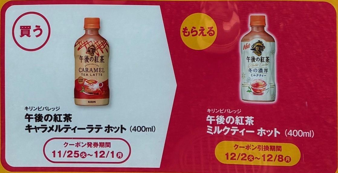 | ■対象商品 キリンビバレッジ 午後の紅茶 キャラメルティーラテ ホット 400ml | ■引換商品 キリンビバレッジ 午後の紅茶 ミルクティー ホット 400ml |