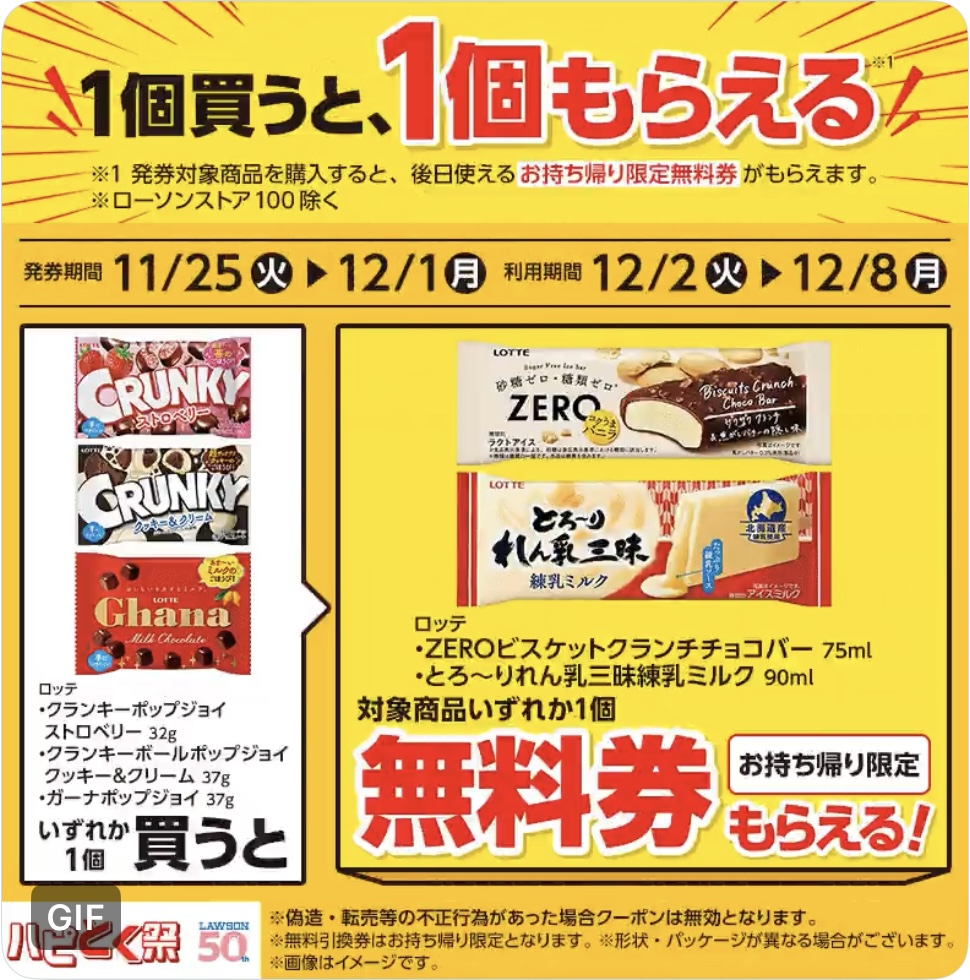 | ■対象商品 ロッテ クランキー ポップジョイ ストロベリー 32g ロッテ クランキー ボール ポップジョイ クッキー&クリーム 37g ロッテ ガーナ ポップジョイ 37g | ■引換商品 ロッテ ZERO ビスケット クランチチョコバー 75ml ロッテ とろ~りれん乳三昧 練乳ミルク 90ml |