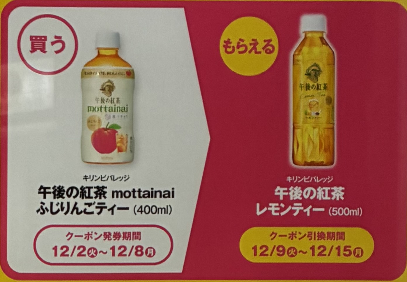 | ■対象商品 キリンビバレッジ 午後の紅茶 mottainai ふじりんごティー 400ml | ■引換商品 キリンビバレッジ 午後の紅茶 レモンティー 500ml |