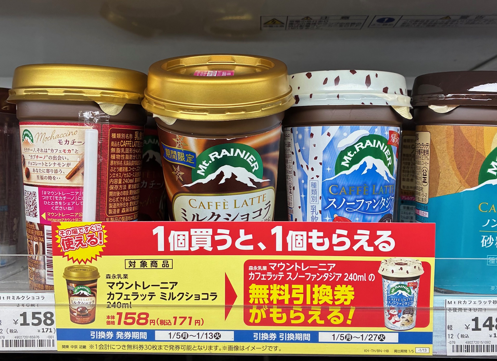 | ■対象商品 森永乳業 マウントレーニア カフェラッテ ミルクショコラ 240ml | ■引換商品 森永乳業 マウントレーニア カフェラッテ スノーファンタジア 240ml |