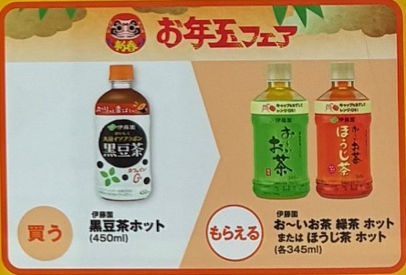 | ■対象商品 伊藤園 黒豆茶ホット 450ml | ■引換商品 伊藤園 お~いお茶 緑茶 345ml 伊藤園 お~いお茶 ほうじ茶 345ml |