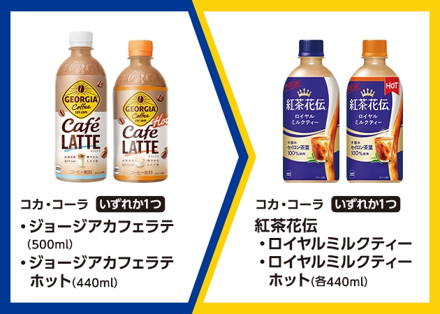| ■対象商品 コカ・コーラ ジョージアカフェラテ(500ml) コカ・コーラ ジョージアカフェラテ ホット(440ml) | ■引換商品 コカ・コーラ 紅茶花伝 ロイヤルミルクティー(440ml) コカ・コーラ 紅茶花伝 ロイヤルミルクティー ホット(440ml) |