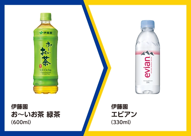 | ■対象商品 伊藤園 お~いお茶 緑茶(600ml) | ■引換商品 伊藤園 エビアン(330ml) |