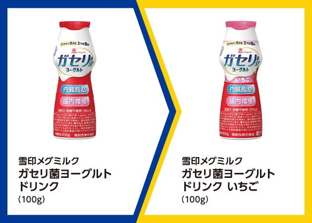 | ■対象商品 雪印メグミルク ガセリ菌ヨーグルトドリンク(100g) | ■引換商品 雪印メグミルク ガセリ菌ヨーグルトドリンク いちご(100g) |