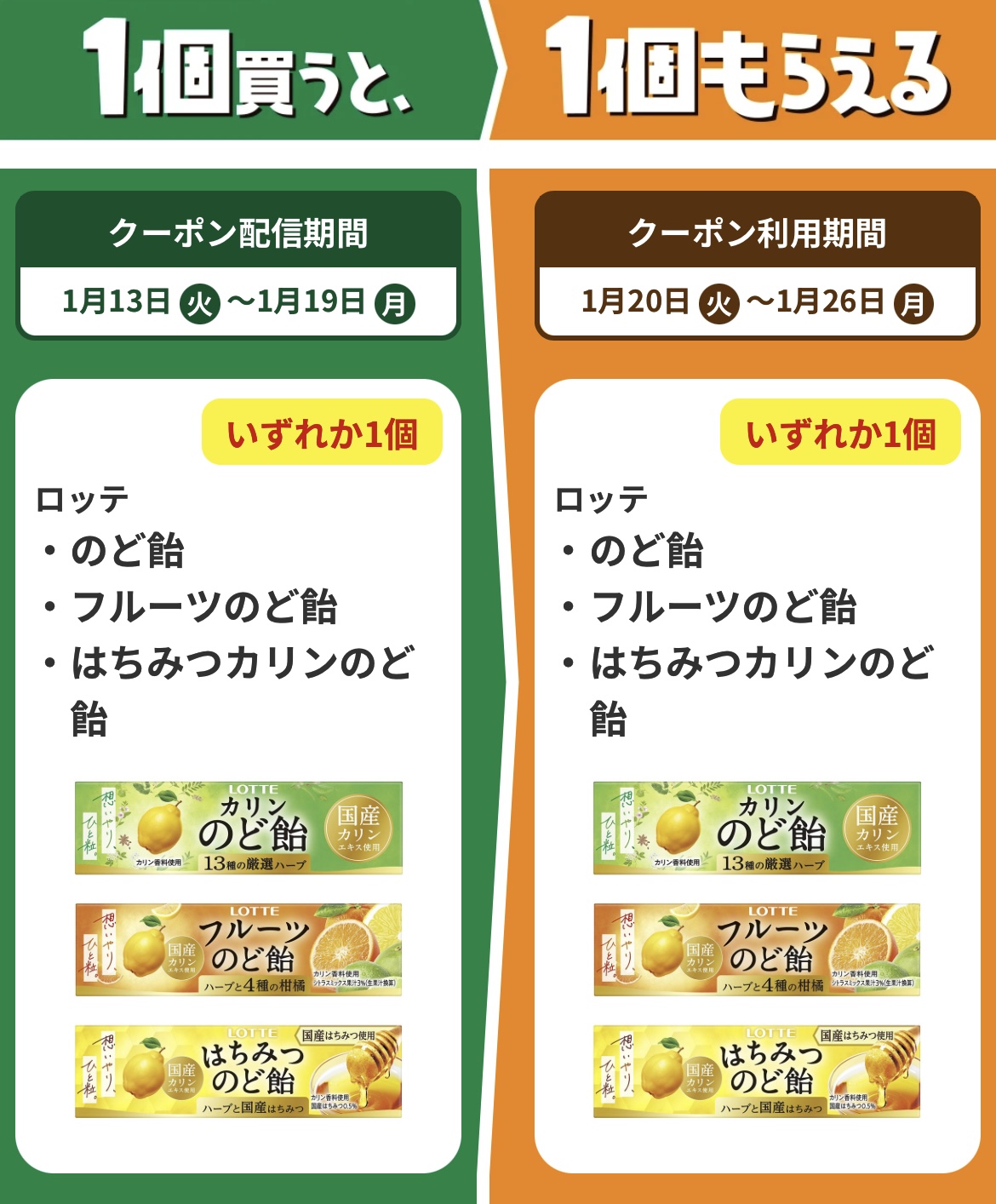 | ■対象商品 ロッテ のど飴 ロッテ フルーツのど飴 ロッテ はちみつカリンのど飴 | ■引換商品 ロッテ のど飴 ロッテ フルーツのど飴 ロッテ はちみつカリンのど飴 |