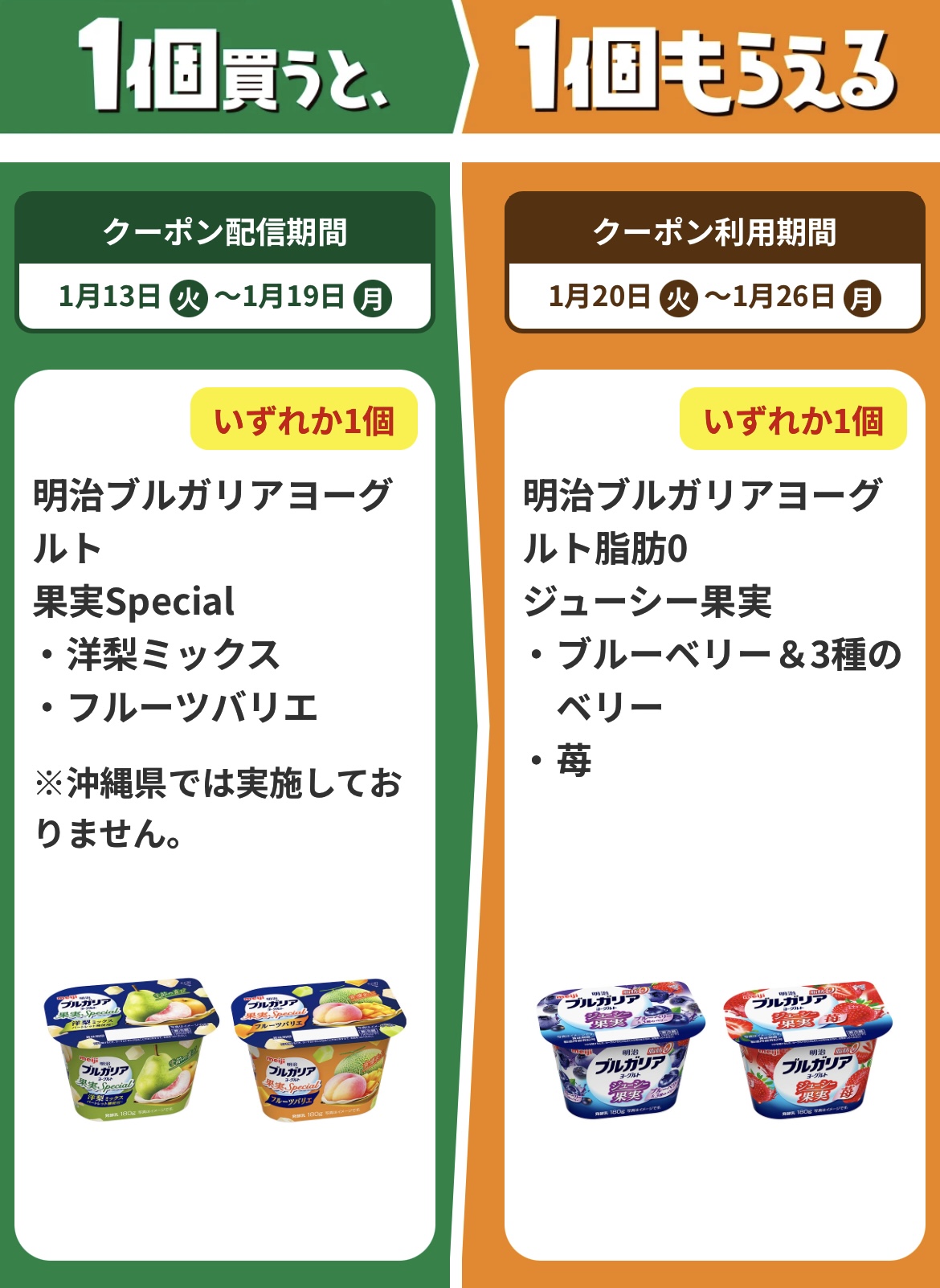 | ■対象商品 明治ブルガリアヨーグルト 果実Special 洋梨ミックス 明治ブルガリアヨーグルト 果実Special フルーツバリエ | ■引換商品 明治ブルガリアヨーグルト脂肪0 ジューシー果汁 ブルーベリー&3種のベリー 明治ブルガリアヨーグルト脂肪0 ジューシー果汁 苺 |