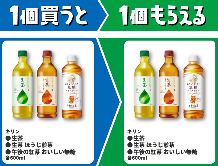| ■対象商品 キリン 生茶 600ml キリン 生茶 ほうじ煎茶 600ml キリン 午後の紅茶 おいしい無糖 600ml | ■引換商品 キリン 生茶 600ml キリン 生茶 ほうじ煎茶 600ml キリン 午後の紅茶 おいしい無糖 600ml |