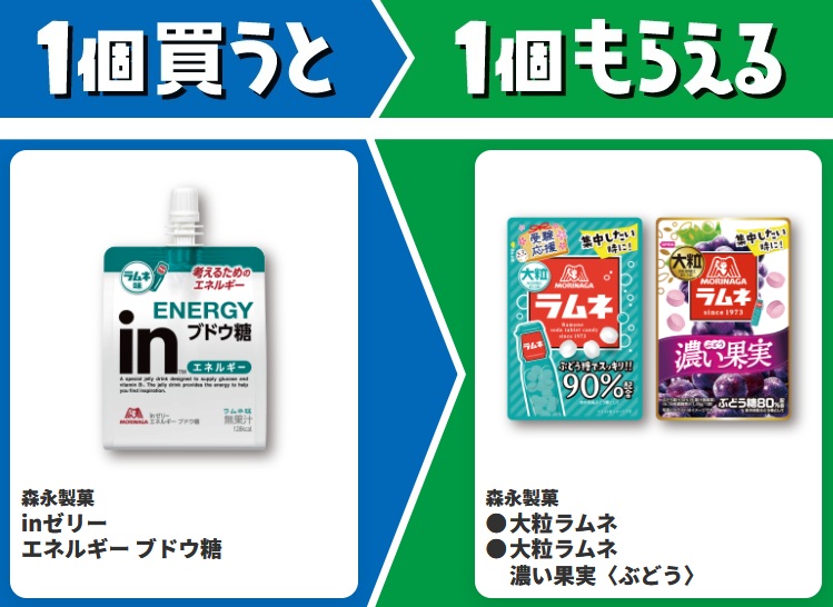 | ■対象商品 森永製菓 inゼリー エネルギー ブドウ糖 | ■引換商品 森永製菓 大粒ラムネ 森永製菓 大粒ラムネ 濃い果実〈ぶどう〉 |