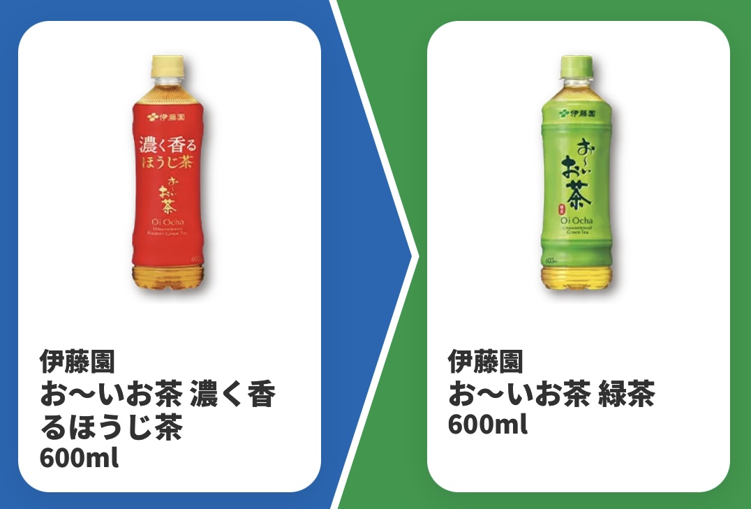 | ■対象商品 伊藤園 お〜いお茶 濃く香るほうじ茶 600ml | ■引換商品 伊藤園 お〜いお茶 緑茶 600ml |
