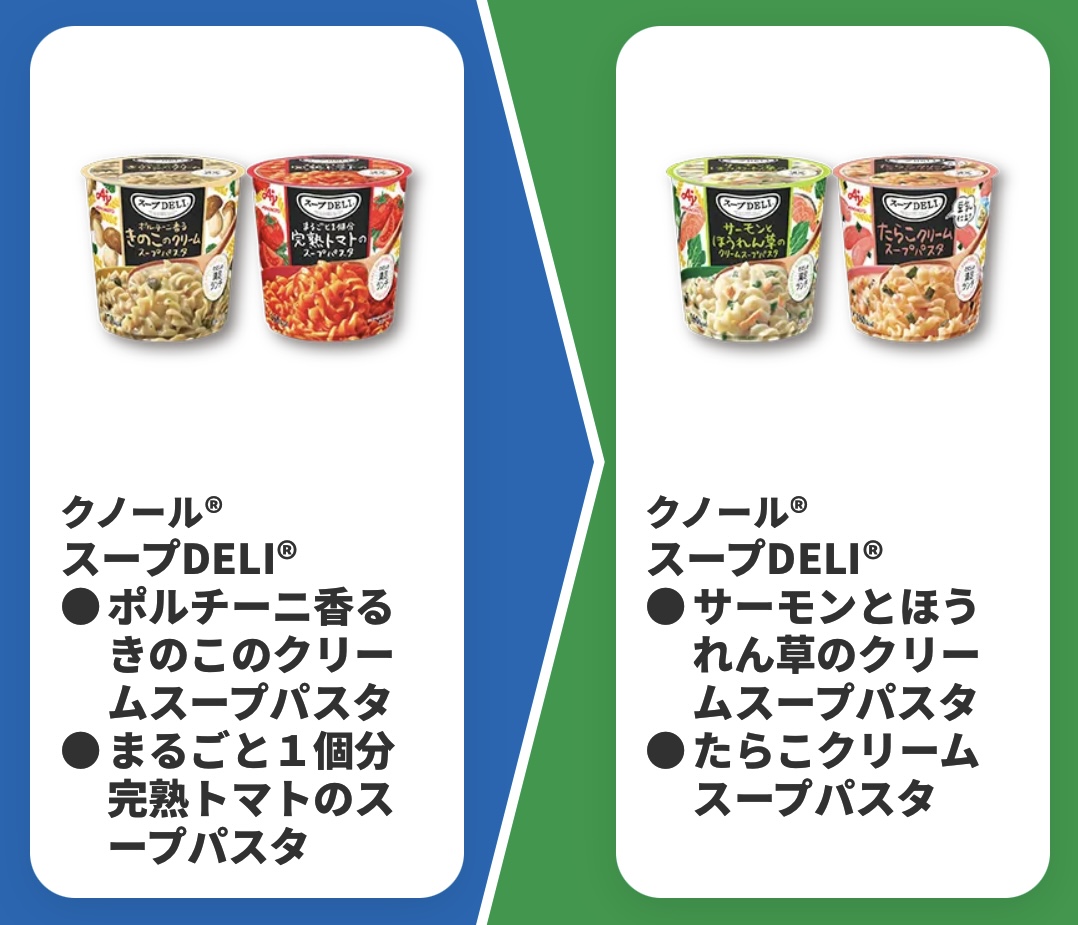 | ■対象商品 クノール スープDELI ポルチーニ香るきのこのクリームスープパスタ クノール スープDELI まるごと1個分完熟トマトのスープパスタ | ■引換商品 クノール スープDELI サーモンとほうれん草のクリームスープパスタ クノール スープDELI たらこクリームスープパスタ |