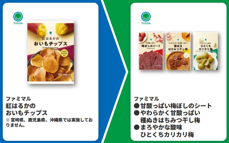 | ■対象商品 ファミマル 紅はるかの おいもチップス | ■引換商品 ファミマル 甘酸っぱい梅ぼしのシート ファミマル やわらかく甘酸っぱい 種ぬきはちみつ干し梅 ファミマル まろやかな酸味 ひとくちカリカリ梅 |