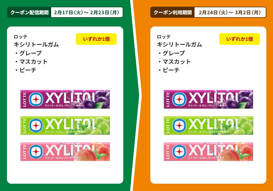 | ■対象商品 ロッテ キシリトールガム グレープ、マスカット、ピーチ | ■引換商品 ロッテ キシリトールガム グレープ、マスカット、ピーチ |