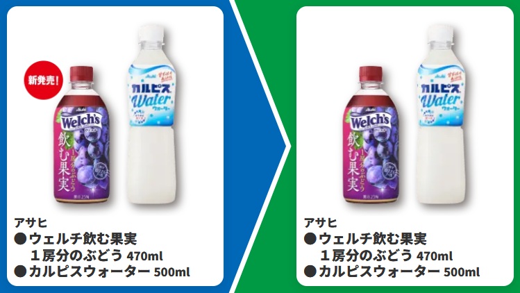 | ■対象商品 アサヒ ウェルチ飲む果実 1房分のぶどう 470ml アサヒ カルピスウォーター 500ml | ■引換商品 アサヒ ウェルチ飲む果実 1房分のぶどう 470ml アサヒ カルピスウォーター 500ml |