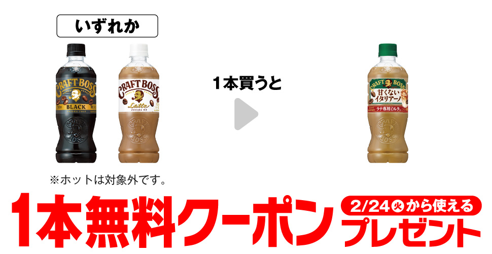 スポンサーリンク スポンサーリンク 【プライチ】2026年2月17日(火)よりセブンイレブンで開催される今週のオトクなプライチ情報 セブンイレブン 2026.02.17 サントリー クラフトボス ブラック、クラフトボス ラテ 各500ml ■発券期間2026年2月17日(火)~2026年2月23日(月)■引換期間2026年2月24日(火)~2026年3月9日(月)■対象商品サントリー クラフトボス ブラック 500mlサントリー クラフトボス ラテ 500ml※ホットは対象外です。■引換商品サントリー クラフトボス 甘くないイタリアーノ 500ml