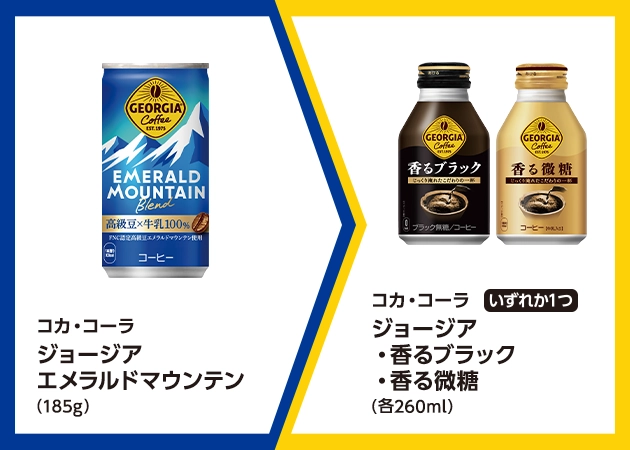 | ■対象商品 コカ・コーラ ジョージア エメラルドマウンテン(185g) | ■引換商品 コカ・コーラ ジョージア 香るブラック(260ml) コカ・コーラ 香る微糖(260ml) |