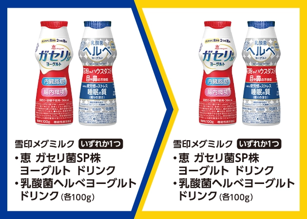 | ■対象商品 雪印メグミルク 恵 ガセリ菌SP株ヨーグルト ドリンク(100g) 雪印メグミルク 乳酸菌ヘルべヨーグルト ドリンク(100g) | ■引換商品 雪印メグミルク 恵 ガセリ菌SP株ヨーグルト ドリンク(100g) 雪印メグミルク 乳酸菌ヘルべヨーグルト ドリンク(100g) |