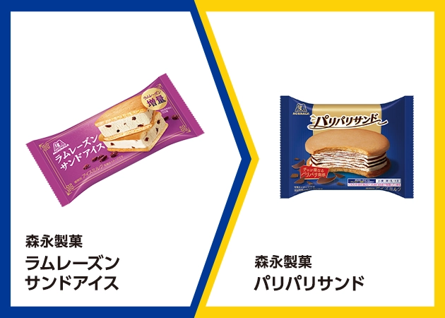| ■対象商品 森永製菓 ラムレーズンサンドアイス | ■引換商品 森永製菓 パリパリサンド |