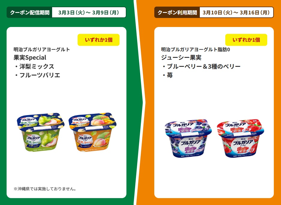 | ■対象商品 明治ブルガリアヨーグルト 果実Special 洋梨ミックス 明治ブルガリアヨーグルト 果実Special フルーツバリエ | ■引換商品 明治ブルガリアヨーグルト脂肪0 ジューシー果実 ブルーベリー&3種のベリー 明治ブルガリアヨーグルト脂肪0 ジューシー果実 苺 |