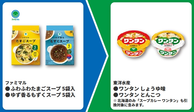 | ■対象商品 ファミマル ふわふわたまごスープ 5袋入 ファミマル ゆず香るもずくスープ 5袋入 | ■引換商品 東洋水産 ワンタン しょうゆ味 東洋水産 ワンタン とんこつ ※北海道のみ「スープカレー ワンタン」も引換対象に含みます。 |