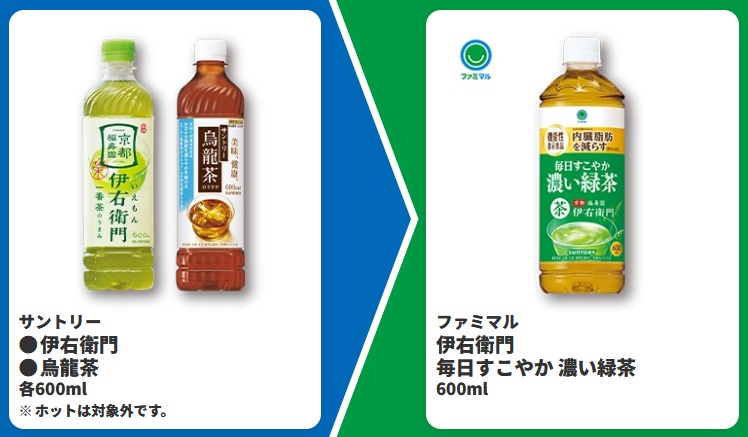 | ■対象商品 サントリー 伊右衛門 600ml サントリー 烏龍茶 600ml | ■引換商品 ファミマル 伊右衛門 毎日すこやか 濃い緑茶 600ml |