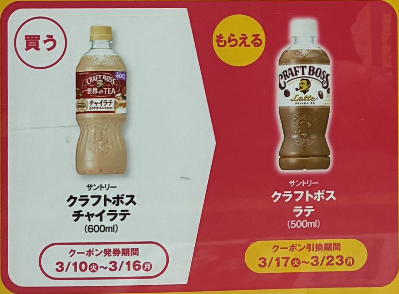 | ■対象商品 サントリー クラフトボス チャイラテ 600ml | ■引換商品 サントリー クラフトボス ラテ 500ml |