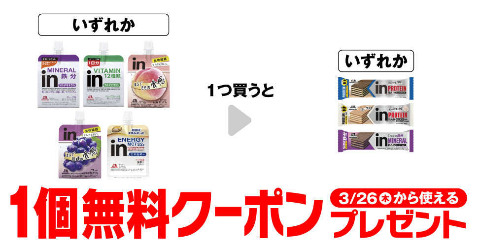| ■対象商品 森永 inゼリー マルチミネラル 森永 inゼリー マルチビタミン 森永 inゼリー フルーツ食感 もも 森永 inゼリー フルーツ食感 巨峰 森永 inゼリー エネルギー MCT | ■引換商品 森永 inバープロテイン バニラ 森永 inバープロテイン ヨーグルト 森永 inバーマルチミネラル ココア |