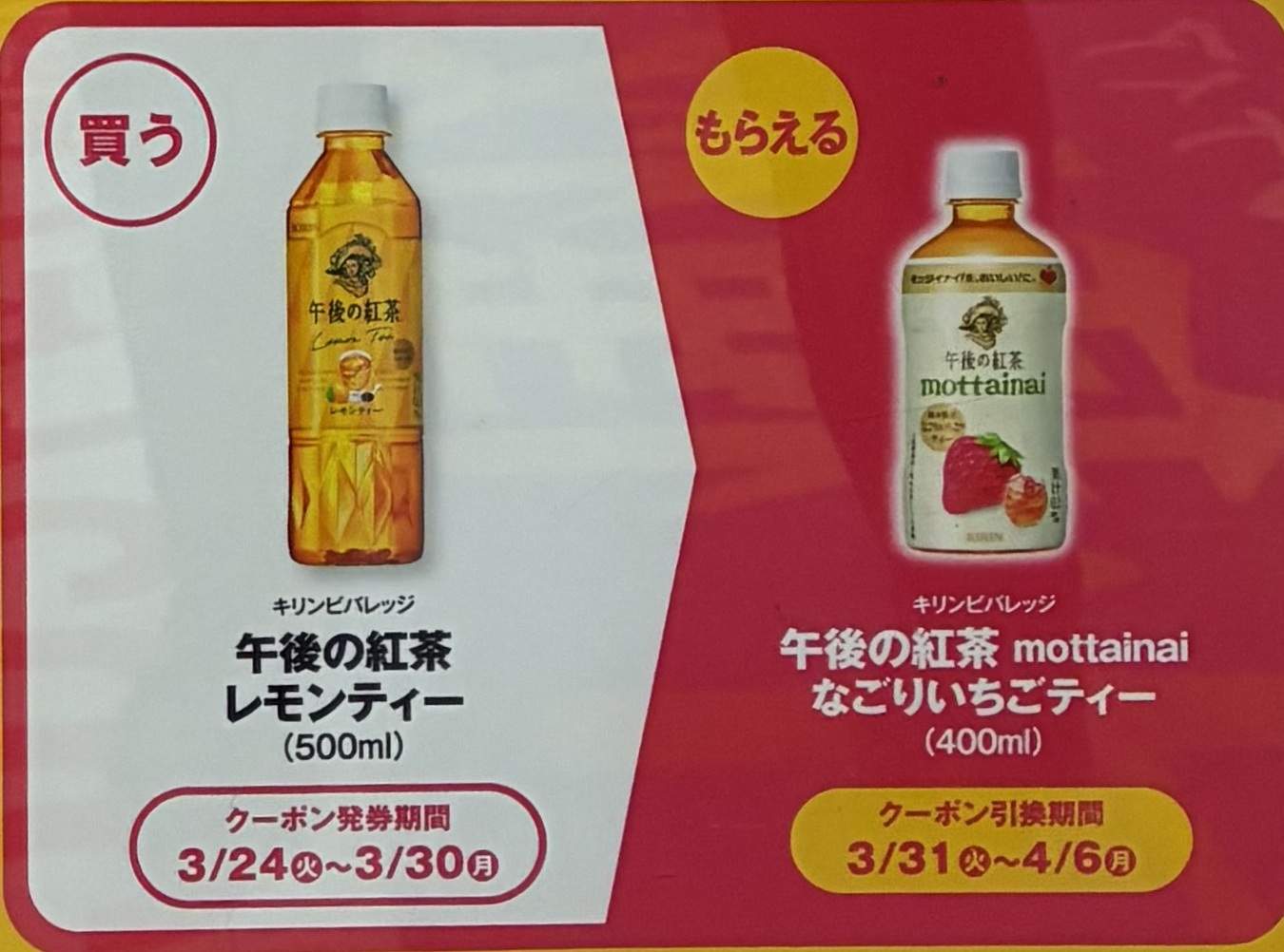 | ■対象商品 キリンビバレッジ 午後の紅茶 レモンティー 500ml | ■引換商品 キリンビバレッジ 午後の紅茶 mottainai なごりいちごティー 400ml |
