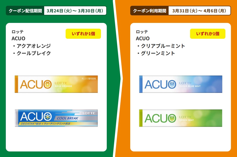 | ■対象商品 ロッテ ACUO アクアオレンジ ロッテ ACUO クールブレイク | ■引換商品 ロッテ ACUO クリアブルーミント ロッテ ACUO グリーンミント |