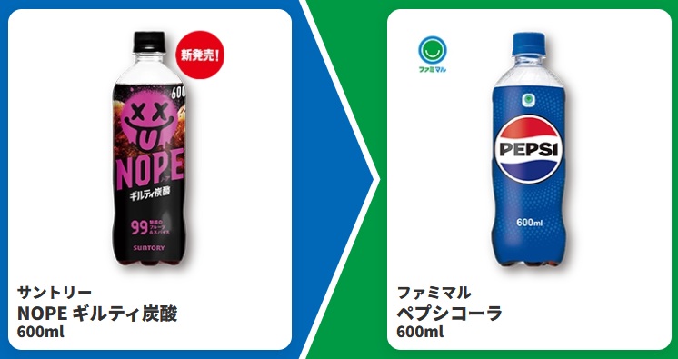 | ■対象商品 サントリー NOPE ギルティ炭酸 600ml | ■引換商品 ファミマル ペプシコーラ 600ml |