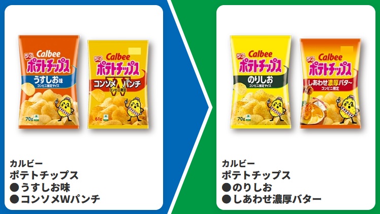 | ■対象商品 カルビー ポテトチップス うすしお味 カルビー ポテトチップス コンソメWパンチ | ■引換商品 カルビー ポテトチップス のりしお カルビー ポテトチップス しあわせ濃厚バター |