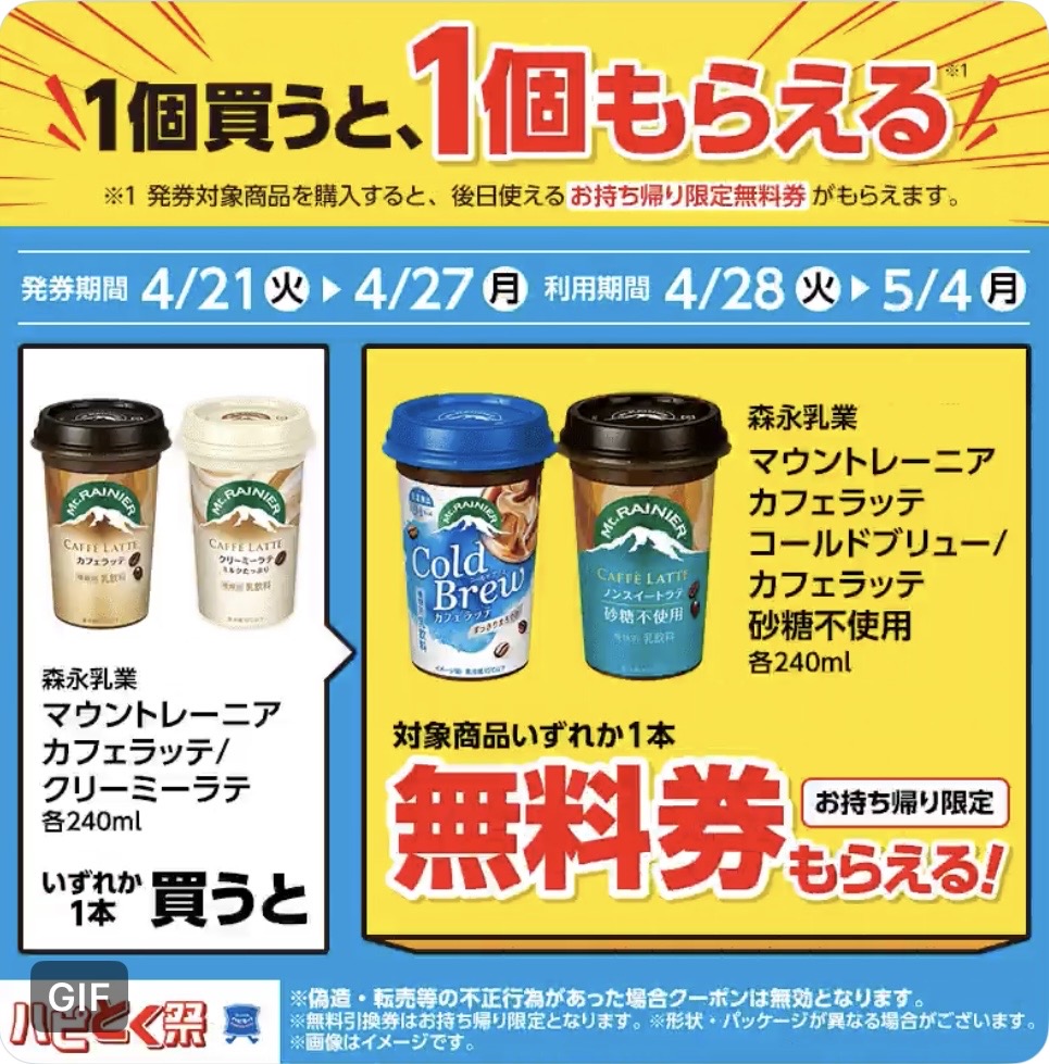 | ■対象商品 森永乳業 マウントレーニア カフェラッテ 240ml 森永乳業 マウントレーニア カフェラッテ クリーミーラテ 240ml | ■引換商品 森永乳業 マウントレーニア カフェラッテ コールドブリュー 240ml 森永乳業 マウントレーニア カフェラッテ 砂糖不使用 240ml |