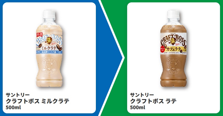 | ■対象商品 サントリー クラフトボス ミルクラテ 500ml | ■引換商品 サントリー クラフトボス ラテ 500ml |