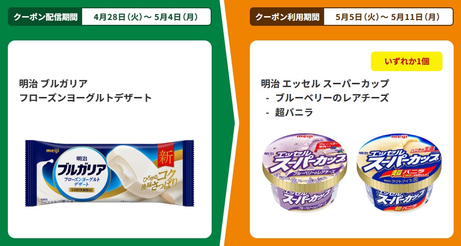 | ■対象商品 明治 ブルガリア フローズンヨーグルトデザート | ■引換商品 明治 エッセル スーパーカップ ブルーベリーのレアチーズ 明治 エッセル スーパーカップ 超バニラ |