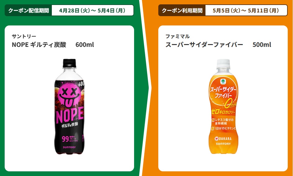 | ■対象商品 サントリー NOPE ギルティ炭酸 600ml | ■引換商品 ファミマル スーパーサイダーファイバー 500ml |