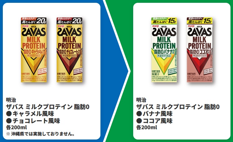 | ■対象商品 明治 ザバス ミルクプロテイン 脂肪0 キャラメル風味 200ml 明治 ザバス ミルクプロテイン 脂肪0 チョコレート風味 200ml | ■引換商品 明治 ザバス ミルクプロテイン 脂肪0 バナナ風味 200ml 明治 ザバス ミルクプロテイン 脂肪0 ココア風味 200ml |